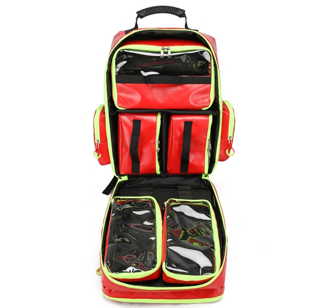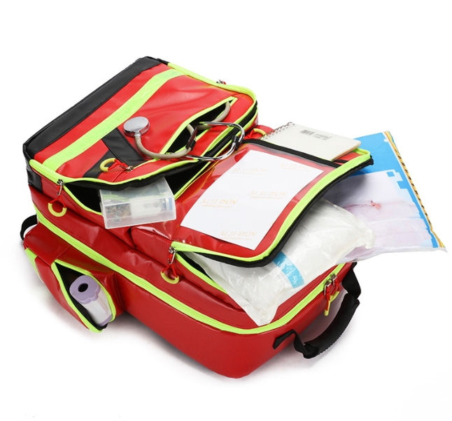 Firefighting large first aid kit:FUNCTIONAL DESIGN - High visibility reflective strips run along the red color medical bag and its outer pockets for easy recognition in the dark. It has a water-resistant bottom designed to keep your equipment dry under wet conditions.<br />