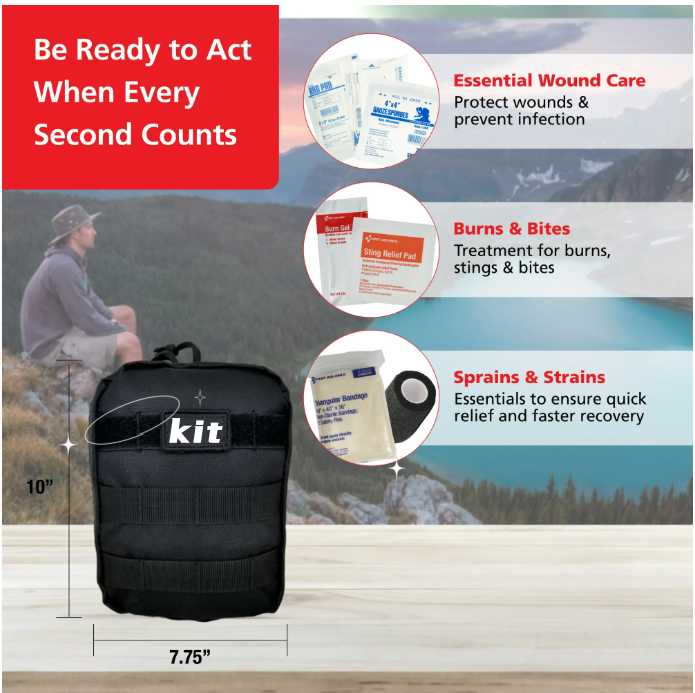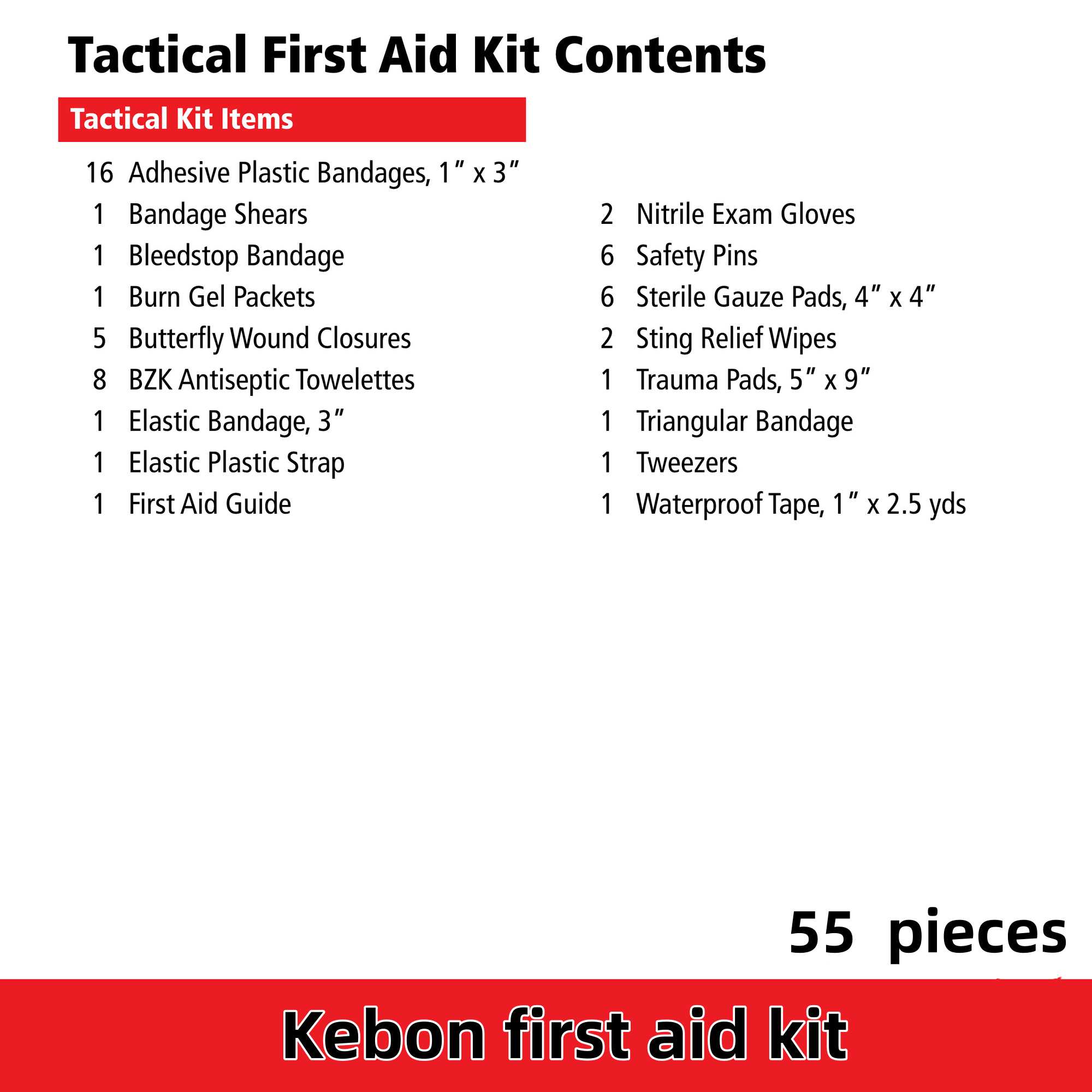 The 55-piece tactical first aid kit is a compact and practical emergency solution designed for outdoor activities, survival situations, and professional use. It is suitable for hiking, camping, travel, and tactical environments where quick access to medical supplies is essential.